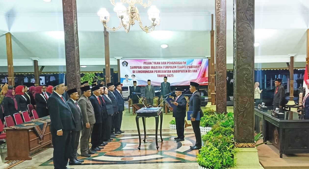 Pesan tersebut disampaikan Bupati Rijanto saat melantik dan mengambil sumpah/janji Jabatan Pimpinan Tinggi (JPT) Pratama di Pendopo Ronggo Hadinegoro, Kamis (13/11/2025) malam. Prosesi pelantikan berlangsung khidmat dengan dihadiri jajaran Forkopimda Kabupaten Blitar, Ketua DPRD, Sekretaris Daerah, kepala OPD, camat, serta pejabat yang dilantik.