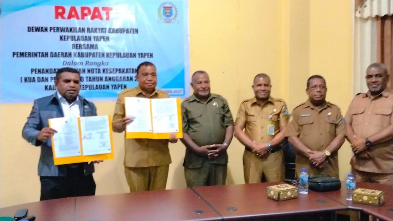 (pelitaekspres.com) –YAPEN- Bupati Kabupaten Kepulauan Yapen, Benyamin Arisoy SE., M.Si, menghadiri rapat Dewan Perwakilan Rakyat Kabupaten (DPRK) Kepulauan Yapen bersama pemerintah daerah dalam rangka penandatanganan Nota Kesepakatan (KUA-PPAS) APBD Tahun Anggaran 2026. Acara berlangsung di ruang rapat DPRK lantai II, Senin (8/12/2025).Rapat tersebut dipimpin langsung oleh Ketua DPRK, Ebzon Sembai, didampingi Wakil Ketua III, Bernad Worumi.