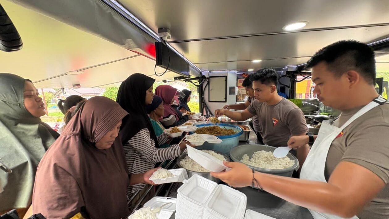 Personel Brimob Lampung tampak bahu-membahu menyiapkan dan mendistribusikan makanan siap saji kepada warga sekitar, termasuk kelompok rentan yang masih berjuang memulihkan kondisi pascabencana.