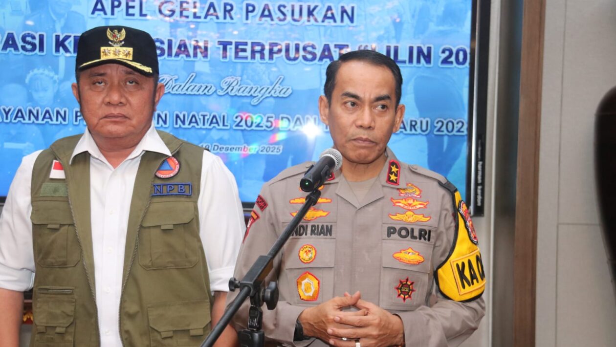 (pelitaekspres.com) – PALEMBANG – Kepolisian Daerah Sumatera Selatan (Polda Sumsel) bersama Pemerintah Provinsi Sumatera Selatan menggelar Apel Gelar Pasukan Operasi Lilin Musi 2025 di halaman Griya Agung Palembang, Jumat (19/12/2025). Meski diguyur hujan lebat sejak awal kegiatan, apel tetap berlangsung dengan tertib dan khidmat sebagai wujud kesiapan serta dedikasi aparat dalam mengamankan perayaan Natal 2025 dan Tahun Baru 2026.