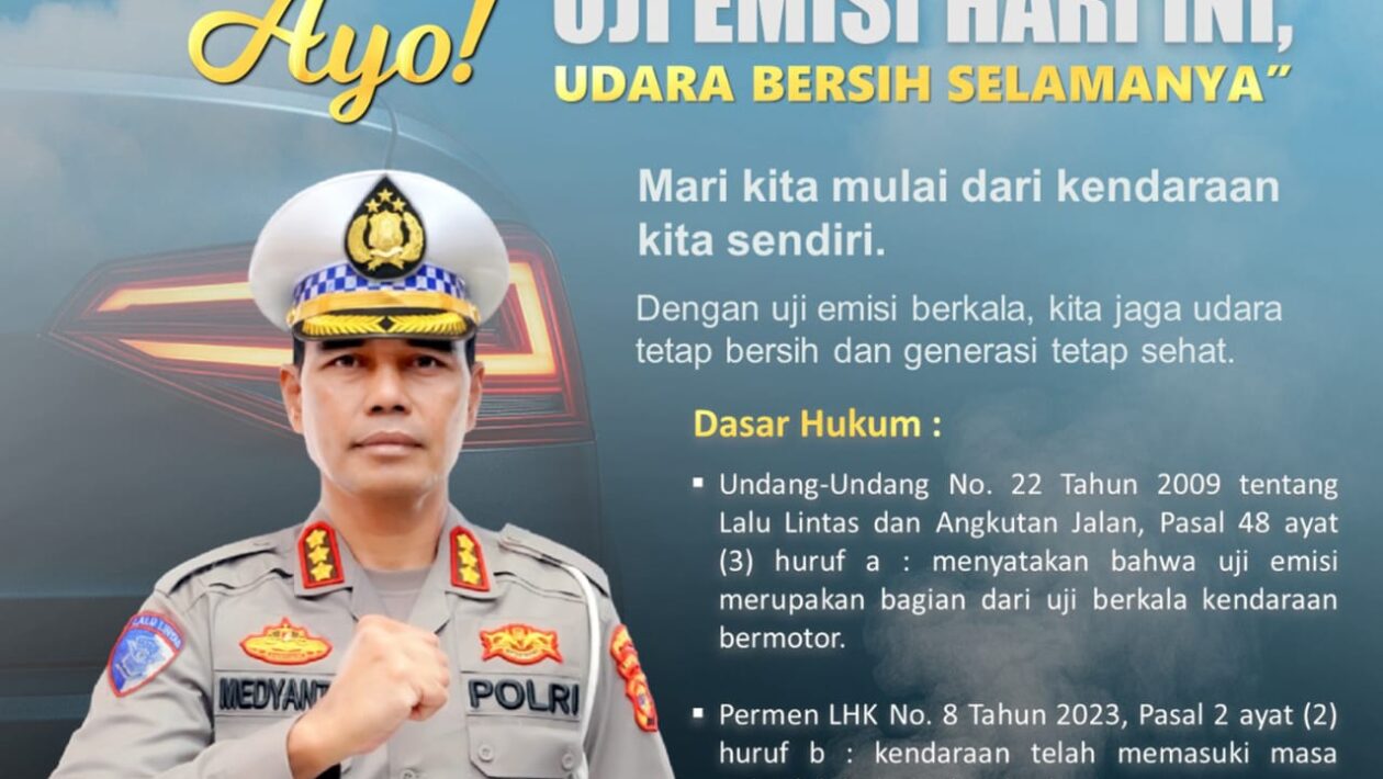 “Mari kita mulai dari kendaraan kita sendiri. Dengan uji emisi berkala, kita jaga udara tetap bersih dan generasi tetap sehat,” ujar Kombes Pol Medyanta.