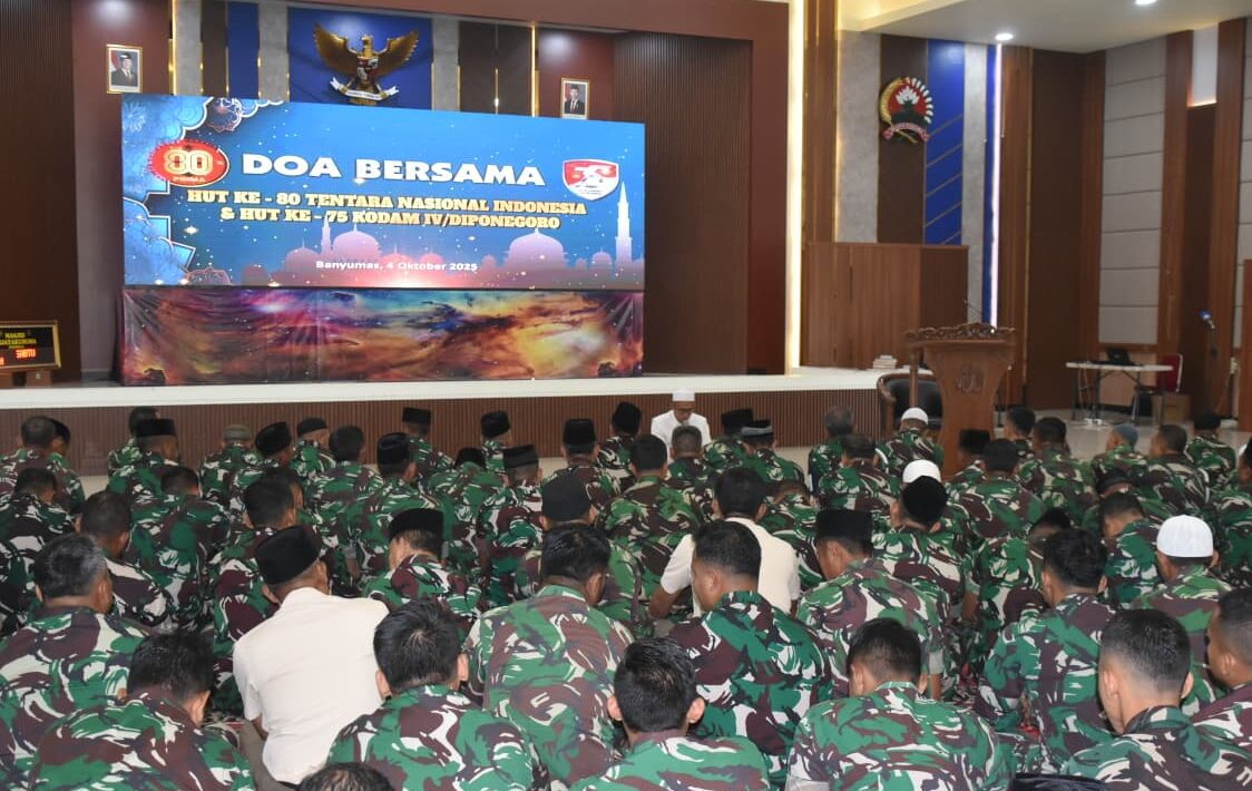 (pelitaekspres.com) -BANYUMAS – Prajurit, PNS dan Persit Korem 071/Wijayakusuma melaksanakan doa bersama sebagai bagian dari rangkaian peringatan Hari Ulang Tahun (HUT) ke-80 Tentara Nasional Indonesia (TNI) dan HUT ke-75 Kodam IV/Diponegoro. Kegiatan berlangsung penuh khidmat di Masjid Wijayakusuma Korem 071, Sokaraja, Banyumas, pada Sabtu (4/10/2025).
