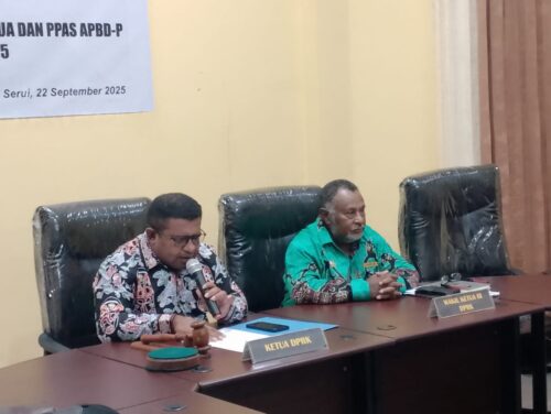 (pelitaekspres.com) –SERUI– Dewan Perwakilan Rakyat Kabupaten (DPRK) Kepulauan Yapen bersama Pemerintah Kabupaten Kepulauan Yapen menggelar rapat paripurna dalam rangka penandatanganan Nota Kesepakatan Kebijakan Umum Anggaran (KUA) dan Prioritas Plafon Anggaran Sementara (PPAS) Perubahan APBD Tahun Anggaran 2025. Sidang tersebut di pimpin langsung oleh Ketua DPRK Yapen Ebzon Sembai didampingi oleh Wakil Ketua lll Bernard Worumi (22/9/2025).
