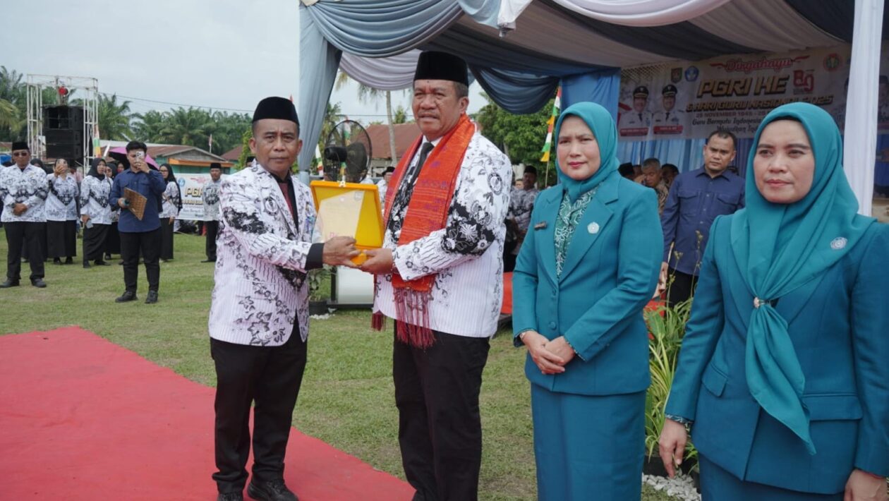 (pelitaekspres.com) – ASAHAN — Peringatan Hari Guru Nasional dan HUT PGRI ke-80 di Lapangan PTPN IV Kebun Sei Dadap tahun ini mengusung tema “Guru Bermutu, Indonesia Maju – Bersama PGRI Wujudkan Indonesia Emas.” Dalam amanatnya, Bupati Asahan menegaskan bahwa tema tersebut bukan sekadar slogan, melainkan agenda nyata untuk menempatkan guru sebagai pusat transformasi pendidikan, Selasa (2/12/2025).