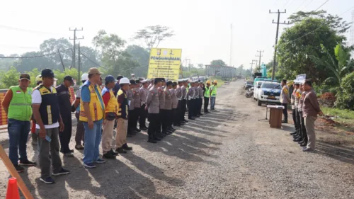 (pelitaekspres.com) -TUBA – Kapolres Tulang Bawang, Polda Lampung, AKBP James H Hutajulu, SIK, SH, MH, MIK, memimpin langsung apel personel gabungan yang terlibat pengaturan arus lalu lintas di lokasi perbaikan jembatan Way Pidada.