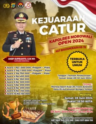 (pelitaekspres.com) – MOROWALI- Kepolisian Resort (Polres) Morowali menggelar Kejuaraan Catur Kapolres Morowali Cup 2024 dalam rangka menyambut Hari Bhayangkara ke 78.