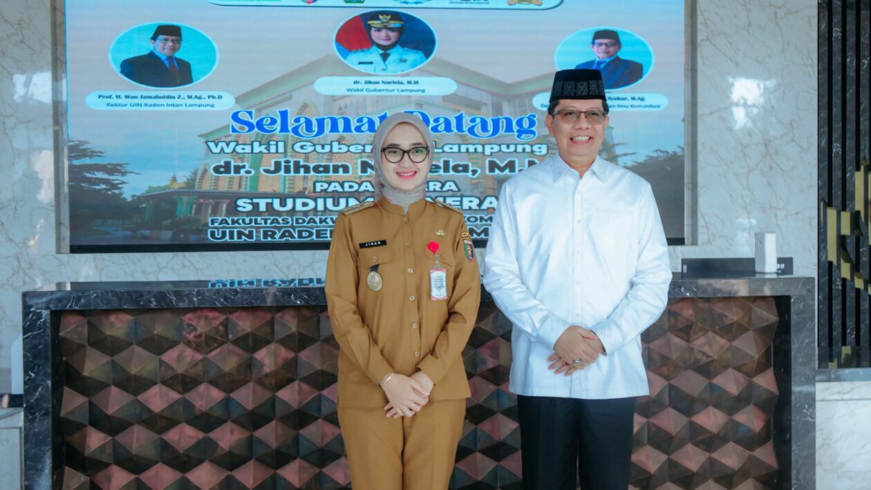 (pelitaekspres.com)- BANDARLAMPUNG — Wakil Gubernur Lampung Jihan Nurlela memberi kuliah umum (studium generale) yang digelar Fakultas Dakwah dan Ilmu Komunikasi Universitas Islam Negeri (UIN) Raden Intan Lampung, di Ballroom UIN, Bandarlampung, Senin (20/10/2025).