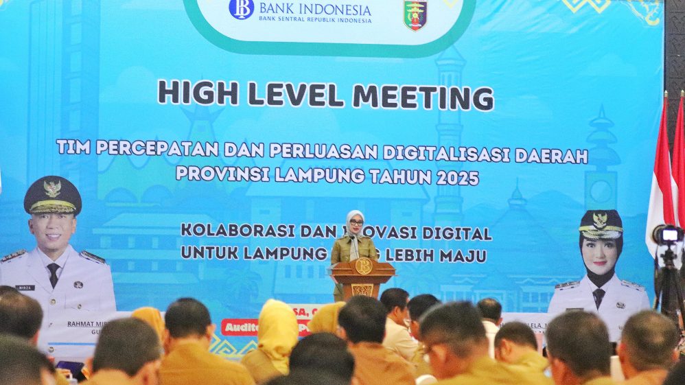 (pelitaekspres.com) –BANDAR LAMPUNG- Wakil Gubernur Jihan Nurlela membuka acara High Level Meeting Tim Percepatan dan Perluasan Digitalisasi Daerah (TP2DD) Provinsi Lampung Tahun 2025, di Auditorium Kantor Perwakilan Bank Indonesia Provinsi Lampung, Selasa (8/7/2025).