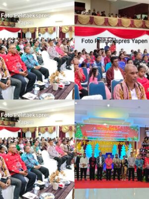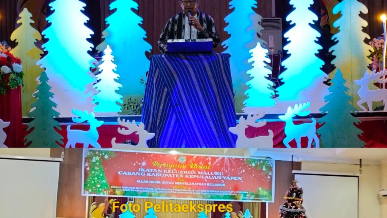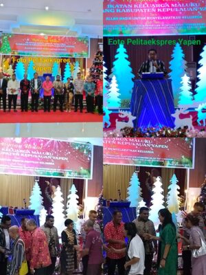 (pelitaekspres.com) –SERUI- Ikatan Keluarga Maluku (Ikamal) Cabang Kabupaten Kepulauan Yapen menggelar Perayaan Natal bersama di Gedung Silas Papare. Acara dihadiri langsung Wakil Bupati Kepulauan Yapen Roi Palunga dan Ketua Dewan Perwakilan Rakyat Kabupaten (DPRK) Kepulauan Yapen Ebzon Sembai S.Pi, didampingi istri Ny. Adolina Elisabet Maniani, Forkopimda, serta pimpinan OPD.Bertema “Allah Hadir Menyelamatkan Keluarga”, perayaan ini mengusung pesan: “Dengan semangat Natal Ikamal, kita menjaga persatuan dan kesatuan, keamanan dalam kerukunan di Kabupaten Kepulauan Yapen, serta ikut menghadirkan damai sejahtera Allah bagi sesama kita.”Pesan Natal disampaikan langsung Ketua Ikamal Cabang Kabupaten Kepulauan Yapen, Harold Wenno. Ia mengawali sambutannya dengan pantun penuh makna: