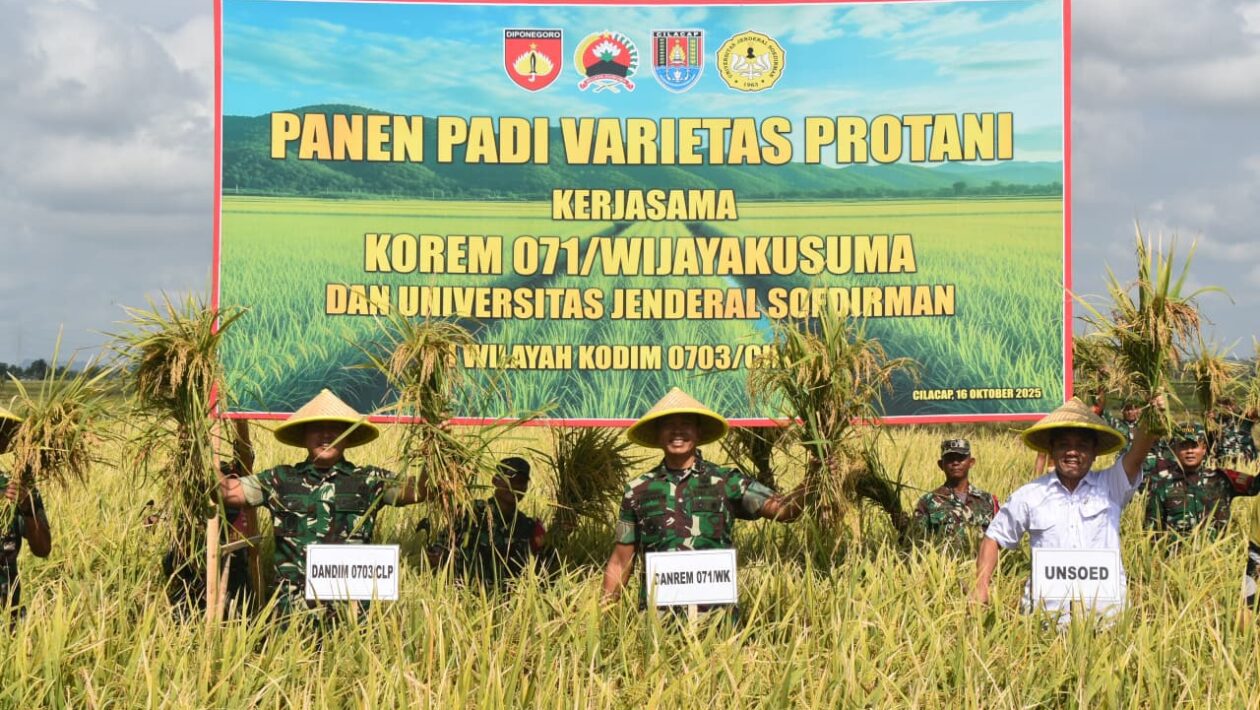 (pelitaekspres.com)- BANYUMAS- Pada Kamis, 16 Oktober 2025, di area persawahan Desa Nusajati, Kecamatan Sampang, Kabupaten Cilacap, dilaksanakan kegiatan Panen Padi Varietas Protani. Kegiatan ini merupakan hasil kerja sama antara Korem 071/Wijayakusuma dan Universitas Jenderal Sudirman (Unsoed) di wilayah Kodim 0703/Cilacap.