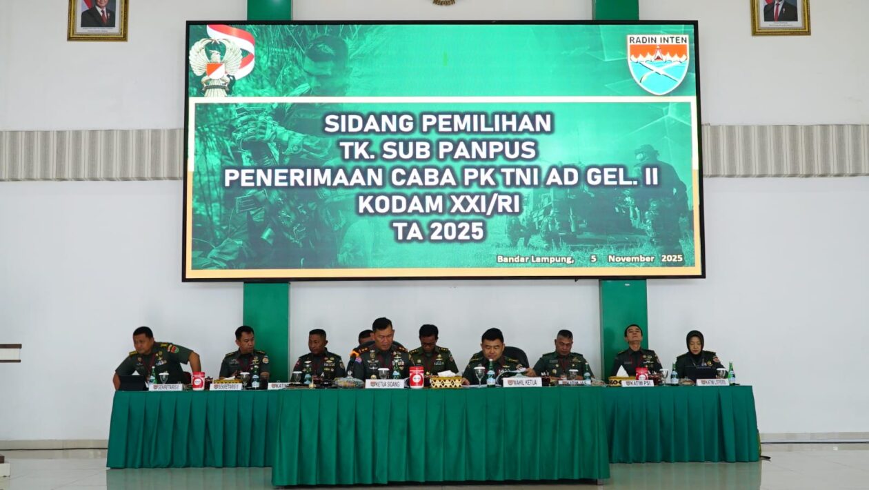 (pelitaekspres.com) - BANDAR LAMPUNG – Pangdam XXI/Radin Inten Mayjen TNI Kristomei Sianturi, S.Sos., M.Si. (Han) memimpin Sidang Pemilihan Tingkat Sub Panpus Penerimaan Calon Bintara Prajurit Karier (Caba PK) TNI AD Gelombang II TA 2025, bertempat di Aula Sudirman Makodam XXI/Radin Inten, Jl. Teuku Umar No. 85, Kelurahan Penengahan, Kecamatan Kedaton, Kota Bandar Lampung, Rabu (5/11/2025).