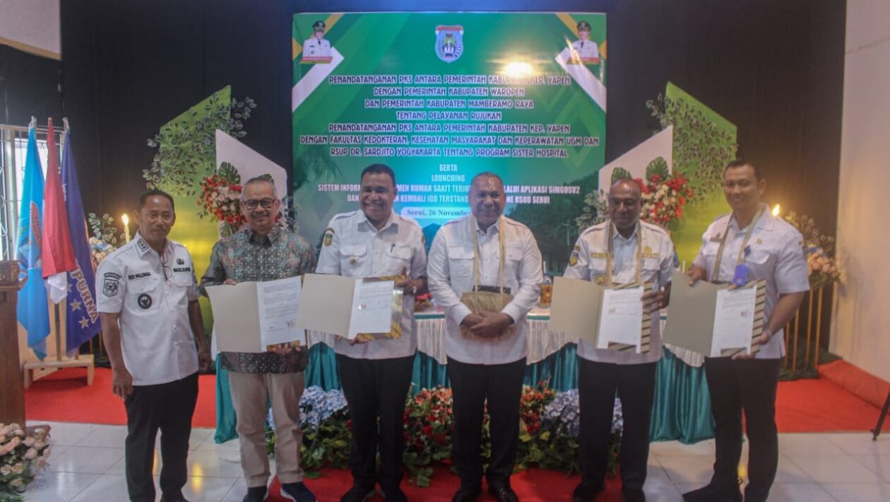 ​Selain peresmian layanan, momen bersejarah ini juga diisi dengan penandatanganan kerja sama strategis. Yang pertama adalah kerja sama dengan Fakultas Kedokteran, Kesehatan Masyarakat, dan Keperawatan (FK-KMK) UGM serta RSUP Dr. Sardjito Yogyakarta untuk Program Pendidikan Dokter Spesialis Afirmasi. Program ini khusus mendidik putra-putri asli Yapen yang akan kembali mengabdi di daerah. Kedua, Pemerintah Kabupaten Kepulauan Yapen juga menandatangani perjanjian pelayanan rujukan dengan Pemerintah Kabupaten Waropen dan Kabupaten Mamberamo Raya, memperkuat posisi RSUD Serui sebagai pusat rujukan utama di kawasan regional.