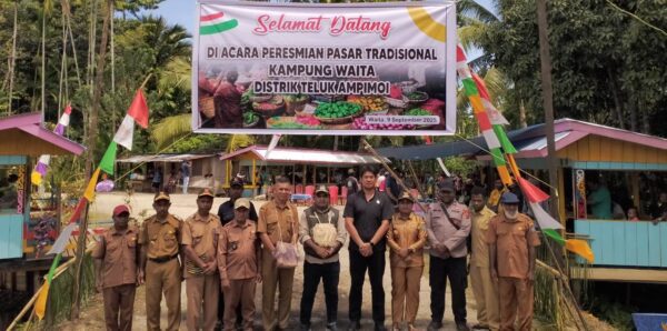 (pelitaekspres.com) –TELUK AMPIMOI – Pasar Tradisional Kampung Waita, Distrik Teluk Ampimoi, Kabupaten Kepulauan Yapen, akhirnya diresmikan pada Selasa (9/9/2025). Hadir mewakili Bupati Kabupten Kepulauan Benyamin Arisoy adalah Plt Kepala Disperindag Haji Alwi Masse bersama Ketua DRPK Kepulauan Yapen Ebzon Sembai dan Anggota DRPK Rian Hendrik Tania.