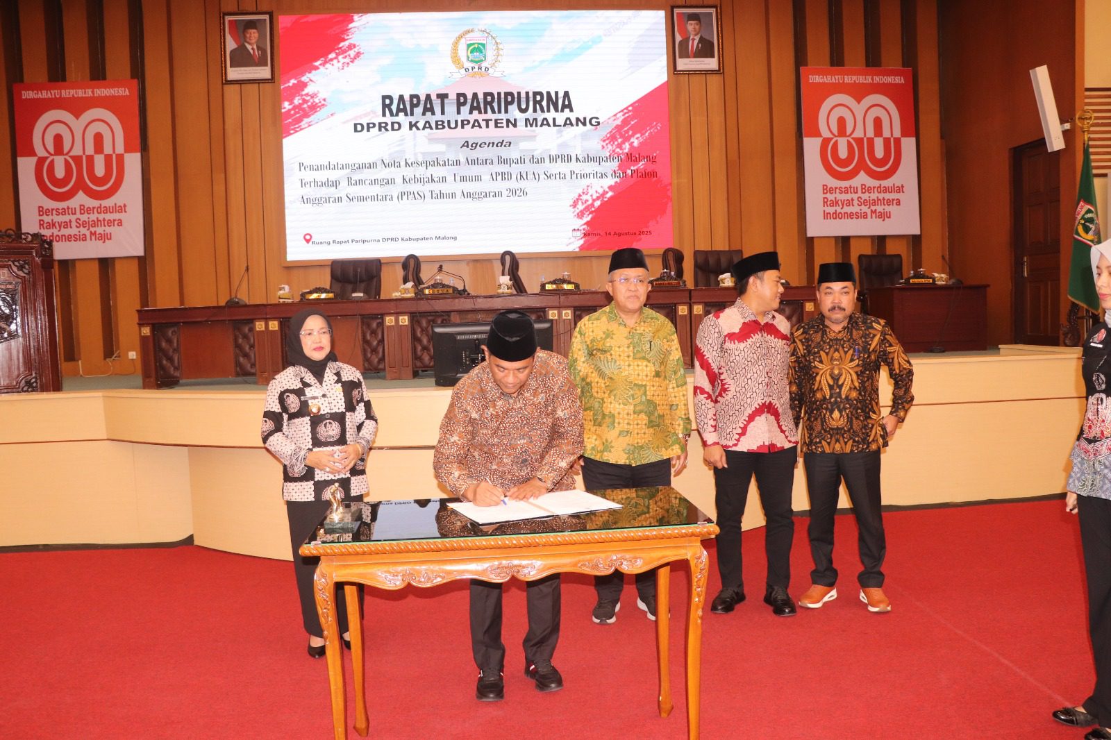 (pelitaekspres.com) –MALANG- Rapat paripurna Dewan Perwakilan Rakyat(DPRD) Kabupaten Malang Dengan Agenda Penandatanganan Nota Kesepakatan Antara Bupati Malang Rancangan Kebijakan Umum APBD(KUA) Serta Prioritas Dan Plafon Anggaran Sementara(PPAS) Tahun Anggaran 2026 yang di laksanakan di gedung DPRD Kabupaten Malang Berjalan dengan Lancar. Kamis (14/08/2026)