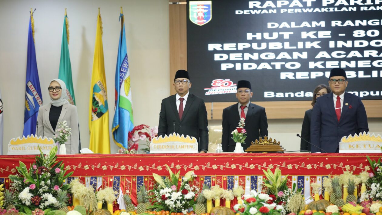 (pelitaekspres.com) – BANDAR LAMPUNG – Gubernur Lampung Rahmat Mirzani Djausal, Wakil Gubernur Jihan Nurlela, unsur Forkopimda Provinsi Lampung, pimpinan dan anggota DPRD Provinsi Lampung, mengikuti Rapat Paripurna Istimewa DPRD Provinsi Lampung mendengarkan Pidato Kenegaraan Presiden Prabowo Subianto dalam rangka Hari Ulang Tahun (HUT) RI ke- 80, secara virtual, di Ruang Sidang DPRD Provinsi Lampung, Jumat (15/8/2025).
