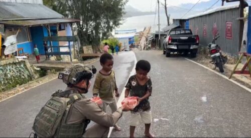 (pelitaeskpres.com) –PANIAI TIMUR — Dalam rangka memperingati Hari Ulang Tahun Korps Brimob Polri ke-80, Satgas Ops Damai Cartenz Sektor Paniai melaksanakan bakti sosial dengan membagikan paket makanan kepada warga di Jl. Aikai, Enarotali, Kabupaten Paniai Timur, pada Jumat (14/11/2025). Kegiatan dipimpin langsung oleh Ipda Nofri Surya Rossa selaku Dansektor Satgas Tindak Sektor Paniai dan melibatkan personel Brimob serta anggota Satgas yang bertugas di wilayah tersebut.