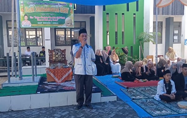 Dalam kesempatan ini kepala Sekolah SMPN 1 Krui, Nikmal Abadi, S.Pd.I., dalam sambutannya menyampaikan bahwa acara ini menjadi motivasi bagi para siswa untuk mengenal sejarah dan meneladani akhlak mulia Nabi Muhammad SAW dalam kehidupan sehari harinya.