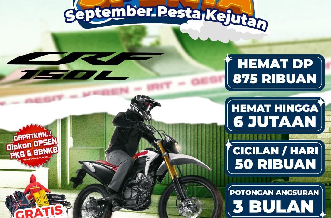 “Di bulan September ini kami ingin memberikan kejutan spesial untuk konsumen setia Honda. Melalui program SPEKTA September Pesta Kejutan, konsumen bisa membawa pulang Honda CRF 150L dengan DP sangat ringan mulai Rp 875 ribuan, cicilan hanya Rp 50 ribuan per hari, ditambah potongan angsuran hingga 3 bulan. Selain itu, masih ada banyak hadiah langsung dan layanan gratis yang bisa dinikmati. Jadi ini momen terbaik untuk memiliki motor Honda dengan keuntungan maksimal,” ujarnya.