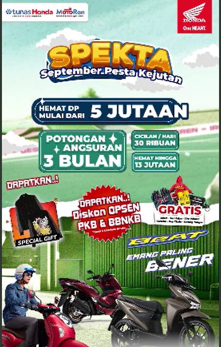 Program SPEKTA September Pesta Kejutan berlaku selama bulan September 2025 di seluruh jaringan Honda Tunas Motor Pratama. Dengan berbagai keuntungan dan kemudahan yang ditawarkan, inilah saat yang tepat untuk memiliki motor Honda terbaru dengan harga lebih terjangkau