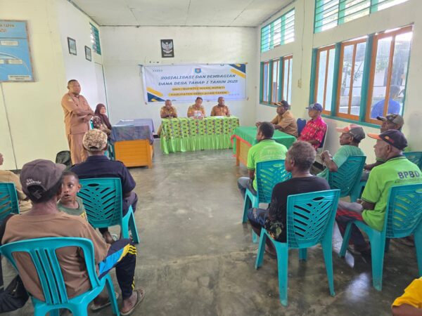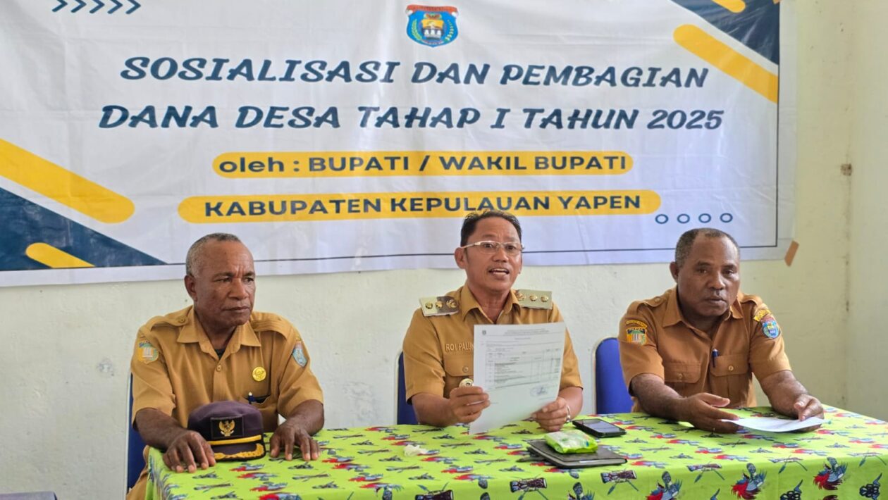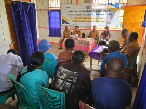 (pelitaekspres.com) – SERUI – Pemerintah Kabupaten Kepulauan Yapen menyalurkan Dana Desa Tahap I Tahun 2025 secara langsung di Distrik Kosiwo, mencakup Kampung Mambo dan Tatui, Senin (1/9/2025). Penyaluran ini disertai dengan sosialisasi agar masyarakat mengetahui secara jelas jumlah dana yang diterima serta peruntukannya.