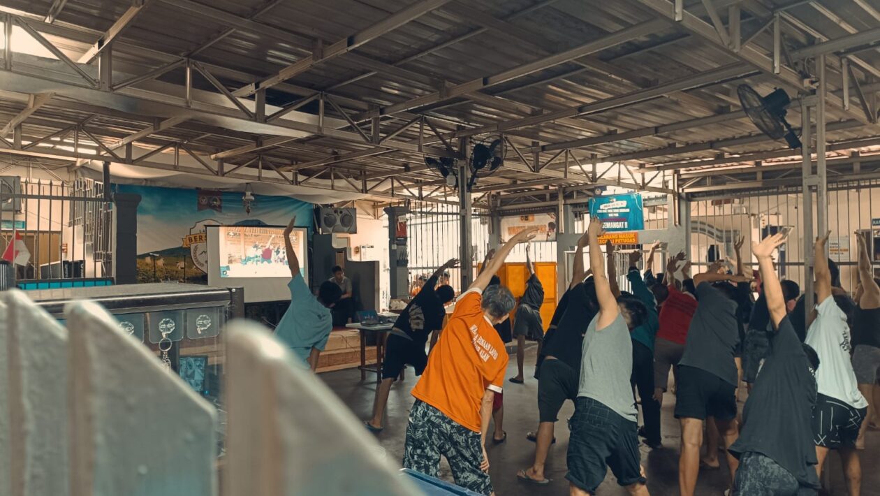 Kegiatan senam bagi seluruh warga binaan dilakukan secara bergantian dengan dibagi menjadi dua sesi.