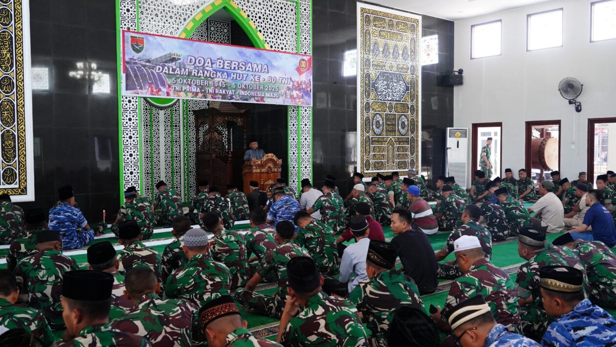 (pelitaekspres.com) -LAMPUNG – Dalam rangka memperingati Hari Ulang Tahun (HUT) ke-80 Tentara Nasional Indonesia (TNI), Komando Daerah Militer XXI/Radin Inten (Kodam XXI/RI) menggelar doa bersama di Masjid Al-Ikhlas Makodam XXI/RI, Jl. Teuku Umar, Penengahan, Bandar Lampung, Sabtu (4/10/2025).