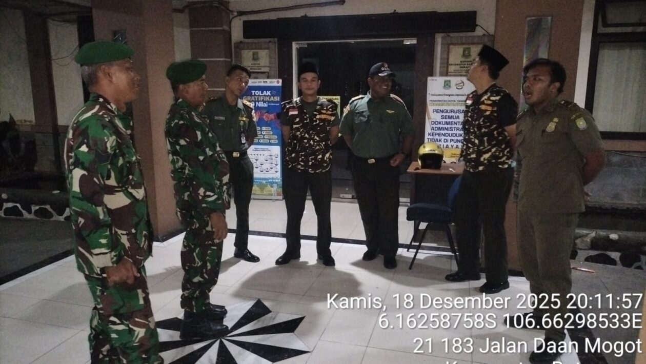 (pelitaekspres.com) – KOTA TANGERANG – Upaya menciptakan situasi wilayah yang aman dan nyaman, Kodim 0506/Tgr melalui personil Koramil 02/Batuceper dan Koramil 05/Ciputat bersama unsur Komponen Pendukung (Komduk) melaksanakan Patroli/Siskamling Keliling pada Kamis malam (18/12/2025).